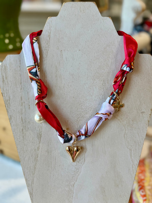 Our Venice scarf necklace will quickly become your go to accessory! Please note: scarf photo shows different charm; pearl heart charm pictured sep...