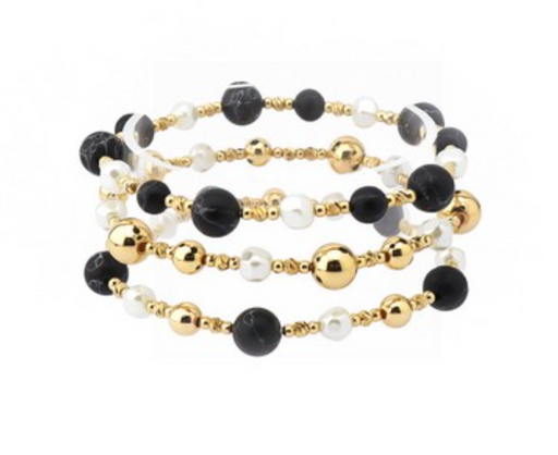 Elegant multi-strand bracelet featuring gold beads, lustrous pearls, and striking black stones for a sophisticated look.