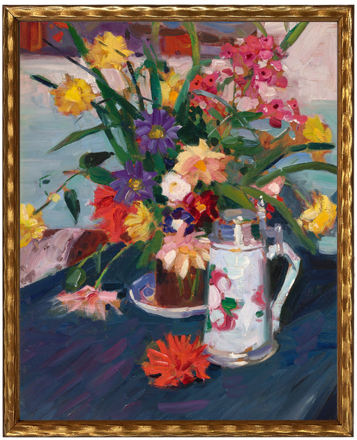 This charming art print features vintage floral arrangements elegantly displayed in a vase alongside a classic teapot, adding a warm and nostalgic ...