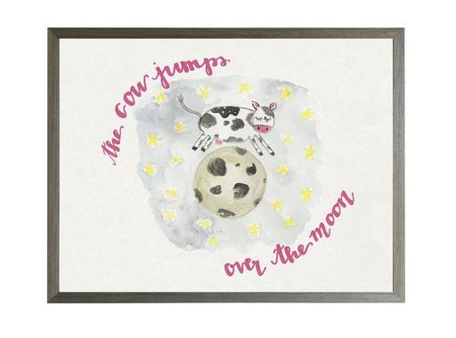 This quality, 24 x 18 framed print features a whimsical Cow jumping over a Moon- so cute for a child's room or playroom. Local pickup only