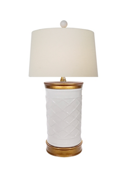 This White Claire lamp features a porcelain white bamboo body, crystal base and a shallow drum 16" off-white shade. It has a 3-way socket with a ma...