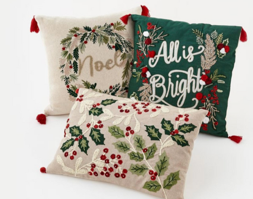 Add a touch of festive fun to any space with one of these holiday pillows. Sold separately. Noel: 18 inches square All is Bright: 18 inches square ...