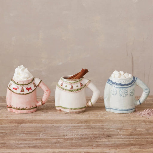 Cozy up your drinkware with these stoneware mugs shaped like snug sweaters. Available in three playful styles, each mug adds a fun, warm vibe to yo...