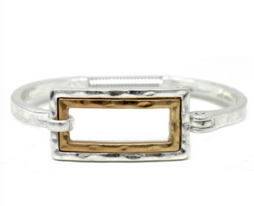 This 8-inch silver cuff bracelet features a rectangular closure elegantly encased in gold, combining refined craftsmanship with a sophisticated des...