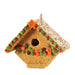 An exterior grade wooden wren house decorated with tasty tibits of gold millet, safflower, white millet, papaya, kiwi, basil floral buttons, red canella, juniper, mango and cranberries.