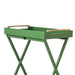 The green lacquered finish injects a pop of color into any setting, embodying the essence of eclectic, French country, and farmhouse styles. Whether used for serving guests or as a permanent fixture in the living space, this tray table is sure to impress with its blend of beauty and versatility.