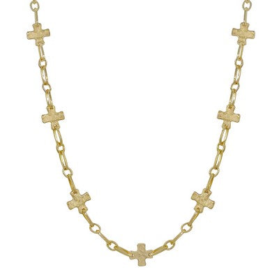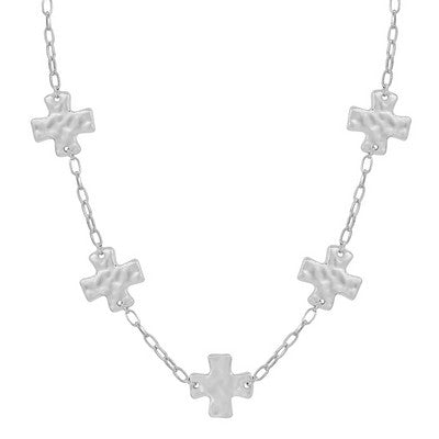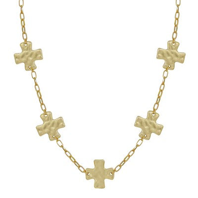 Delicate gold chain stretches 16 to 18 inches, adorned with charming hammered cross charms that catch the light beautifully.