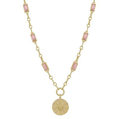 Delicate gold chain necklace featuring a luminous light pink crystal paired with an elegant coin pendant. Adjustable 16-18 inch length adapts to yo...
