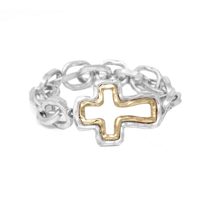 Effortless elegance meets versatile style with this stretch bracelet featuring a striking silver link design accented by a mixed-metal cross charm....