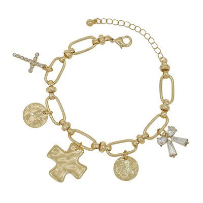 Elegant gold link bracelet featuring a striking cross pendant and textured charm accents that add dimension and spiritual significance to your ever...