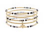 Black multi crystal stretch bracelet featuring a cross charm for a stylish and versatile accessory.